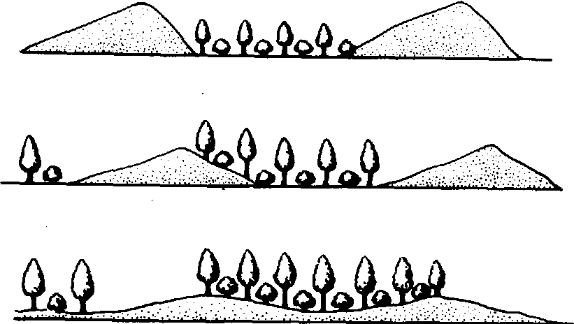 水土保持林的造林方法,分直播、植苗、分殖和封山育林四种。❶直播造林。一般是大粒种子,如核桃、板栗、油桐、油茶等。中小粒种子,如油松、华山松在较好的立地条件下也可直播造林。 ❷植苗造林。包括从苗圃地掘苗、运苗、挖坑、植树、填土踏实的全过程。 ❸分殖造林。是利用林木无性繁殖特性进行造林的方法。有插干、压条、埋条三种。插干采用2~3年生枝条截成上头平、下头斜,长短相同的插条栽入地下。压条是将2~4根1米左右的枝条根端交叉埋在深0.5米,长0.6米,宽0.3米的坑内,埋土后枝梢露出地面10~12厘米。埋条有全埋和露枝两种。全埋是将1~2年生枝条,长1~2米,除去侧枝埋入3~6厘米深土中。露枝是将1~2年生枝条埋入20~30厘米深土中。侧枝露出地面3~6厘米。 ❹封山育林。在自然条件较好的荒山地区,有计划地将部分山地封禁,禁止樵采、放牧等人为活动,依靠自然和人工方法恢复森林植被。 防风固沙林 为防治风沙,控制沙漠化而营造的森林。营造防风固沙林可以防止风蚀,固定流沙,保护农田和牧场;改良土壤,改造气候,变沙荒地为农牧业生产基地。根据沙地状况分固定、半固定沙丘和流动、半流动沙丘防风固沙林。❶固定、半固定沙丘防风固沙林,造林方法有两种:一是条带状造林。林带与主风方向垂直,带宽20~40米,林带间距100~200米和50~100米,为避免造林整地引起风蚀,可采用隔带分期造林,在较干旱沙地上,每隔30~50米,营造一条30~50米宽的林带;在较湿润沙地上,带宽和间距可增至50~60米,几年后,再在空带上造林。二是斑块状造林,要根据环境条件确定斑块造林大小。 ❷流动、半流动沙丘防风固沙林,可采用四种造林方法。一是前挡后拉造林法:在沙丘背风坡前让出2~3米易受沙埋的地段,栽植旱柳、小叶杨、沙柳等;在迎风坡1/3~1/2以下营造沙柳、紫穗槐、花棒等灌木,这样前有林挡,后有林拉,几年后,沙丘就逐渐被拉平(图1)。二是又放又固造林法:适用于流动速度很快的比较低矮的新月形沙丘或长条状沙丘。采用固定一排,放开一排的间隔造林法,选定一排沙丘,在上面设置格状沙障,栽植沙柳、花棒等灌木,使其固定下来,相邻排沙丘不造林,任其移动,几年后,移动沙丘消失,被固定的沙丘体积增大,两排被固定的沙丘间成为平坦地带,可作农田或果园(图2)。三是半绿半黄造林法:在沙丘迎风坡2/3以下或整个坡面上密集营造条带状灌木林,背风坡空着不造林。具体作法是每隔一定距离,沿沙坡等高线开沟栽植沙柳、花棒等灌木,沙柳采用插条造林,沟宽20厘米。此法保存率高,林木生长快,固沙作用大,可不设沙障保护。四是倒对沙窝造林法;第一年在丘间低地造林,以后再在沙丘移动后新出现的丘间低地继续造林,每年如此,这样不断追赶,直到流沙被固定,沙丘被基本拉平为止(图3)。在流动和半流动沙丘迎风坡和风蚀特别严重的干旱沙地上造林,必须先搭设沙障,以削弱风速,控制流沙,使植物免遭沙压、沙埋和沙割,保证其成活和生长(见沙障)。防风固沙林的树种宜选择适应性强、抗风蚀、耐干旱、耐瘠薄;沙埋、沙压后能很快长出不定根;生长迅速,繁殖容易的树种。