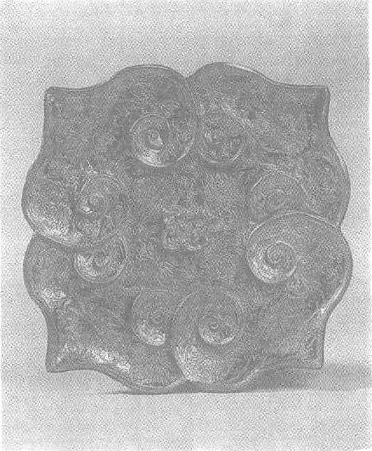 元。高1.3厘米,边长16厘米。1959年江苏省吴县吕师孟墓出土。南京博物院藏。此盘凿花锤制而成。盘边以四组突起的如意纹构成,盘心以四如意纹组成一朵四瓣小花,空隙以缠枝花作衬托,凿刻精细,图案简洁,线条流畅。底有“闻宣造”款。
