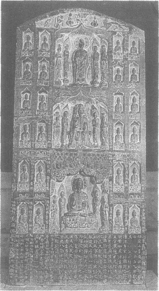 | 释义 | “陈海龙”等造四面像碑北周保定二年(公元562年)。高120厘米,宽56.5厘米。山西省安邑县出土。山西省博物馆藏。碑四面造像。正面造像分三层,主龛居中,龛内刻佛与弟子侍从,本尊或站或立,神态各异。其左、右各刻12个小龛,内均饰坐佛,龛框刻造像人与所造像名,碑下刻铭记:“起像主陈海龙一心侍佛,保定二年岁次壬午正月壬寅月廿四日乙丑敬造”。背面造像亦分三层,每层刻以神态不同,体貌各异的主佛九尊。佛下部刻造像铭记:“象主比丘𡰱法藏比丘比训……”