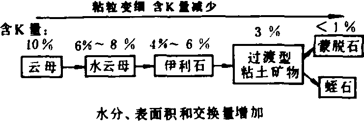 各种含钾矿物的抗风化性是不同的,主要取决于矿物的晶格构造和化学成分。含钾硅酸盐矿物的晶格构造,一为片状构造(云母、伊利石和其它次生矿物);另一为架状构造(长石)。通常,架状结构的长石类矿物的稳定性大于片状结构的云母类矿物。因为架状结构的硅氧四面体的联结程度较大,盐基性较弱,Si—O键较多。而片状结构的每个硅氧四面体只和另外三个硅氧四面体相连,层与层之间皆有阴离子相联,盐基性较强,硅氧键较少。从矿物晶格键能的强弱来看,架状结构硅酸盐的键能较强,因而稳定性也较大。在长石类矿物中,微斜长石抗风化性高于正长石。因为微斜长石为三斜对称组合结构,而正长石则为单斜对称组合结构。在云母类矿物中,因化学组成及晶胞体积不同,白云母较黑云母稳定得多。图中展示了水云母向粘土矿物转化的过程。