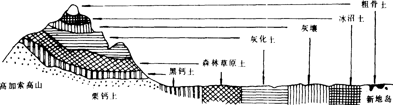 | 释义 | 土壤带turangdai土壤是成土因素综合作用下的产物。由于地表热量的纬度差异,天然植被必然自赤道向两极呈有规律的更替,进入土壤中的有机质的组成和数量,以及土壤腐殖质化过程也必然随纬度不同而有差异,加之岩石风化过程的纬度差异,使土壤的形成和发育沿赤道向两极发生有规律的变化,从而使土壤的分布表现出明显的纬度地带性。土壤的纬度地带性在欧亚大陆、非洲大陆以及北美大陆的东部都有较为明显的表现,而在苏联欧洲部分表现得最为明显。如果从苏联欧洲部分的北部苔原带到南部沙漠取一断面,那么,土壤由北而南的分布顺序是: 苔原带的冰沼土、泰加林带的灰壤、森林草原带的灰色森林土、草原带的黑钙土、干草原带的栗钙土、荒漠草原带的棕钙土及荒漠带的荒漠土 (如图)。