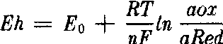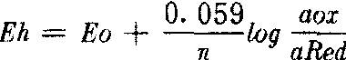 | 释义 | 土壤氧化还原电位turang yanghua huanyuan dianwei土壤氧化还原能力的度量方法。氧化作用和还原作用在土壤化学反应和土壤生物化学反应中占极重要地位。土壤溶液中氧化作用主要由自由氧、NO3-和高价金属离子所引起。还原作用是由某些有机质分解产物,嫌气性微生物生命活动以及少量的铁、锰等金属低价氧化物所引起。氧化还原能力常用氧化还原电位(Eh)表示,计算时常用聂恩斯特(Nernst)公式: