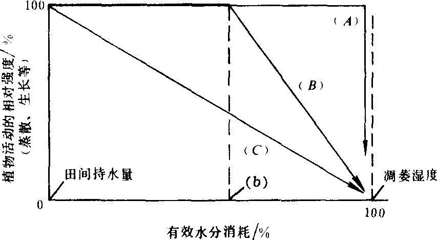 关于土壤水分的有效性问题, 本世纪20~50年代研究者多认为, 土壤水分在凋萎湿度以上和田间持水量以下的范围内, 有效性是相同的, 也就是说, 在凋萎湿度以上时, 植物吸收水分的功能不受土壤湿度大小的影响。这个概念一直被广泛应用, 并用于灌溉的实际工作中。后来, 一些研究者提出证据, 说明有效性是随土壤含水量减少而减小的。另一些研究者认为,土壤水分有效性可分为“能充分吸收”和“吸收渐减”两段, 即当土壤含水量在某一数值(这个值称临界点)以上时,作物按可能蒸散量ETm吸收水分, 到土壤水分低于临界值以后, 吸收量逐渐减小。图1表示出三种模式。其纵坐标表示植物活动的相对强度(蒸散量、相对蒸散量ETa/ETm或生长速度); 横坐标表示有效水分的消耗程度, 从田间持水量开始消耗量为零, 到凋萎湿度时有效水分已全部消耗完, 为100%。(A)线表示从田间持水量到凋萎湿度之间都同等有效, 单位时间蒸腾(或蒸散)量始终保持最大值。曲线(B),表示从田间持水量到临界土壤含水量b之间都同等有效; 含水量在b点之下, 有效性逐渐减小。(C)线表示, 有效性随土壤含水量呈直线减小。联合国粮农组织(FAO) 在灌溉方面, 采用曲线(B)模式, 并综合许多研究成果, 列出不同作物相当于临界点b的临界土壤水分系数P(见附表13), 和农田土壤水分预报。