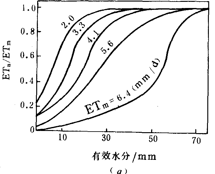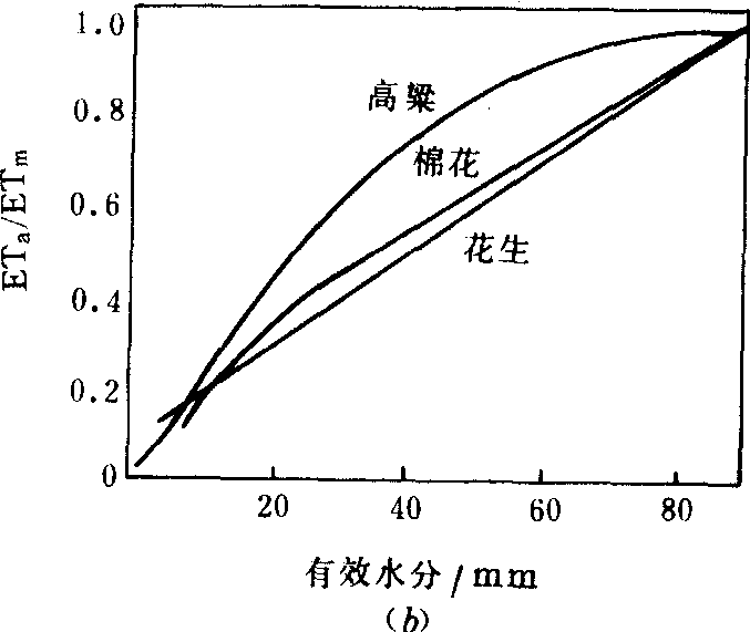 t大时, 比值减小得很快。图2b是R.O.斯莱蒂斯对三种作物的试验结果。高粱保持高值 ETa/ETm 的土壤有效水分范围较大, 而棉花、花生的ETa/ETm 比值随土壤水分的消耗而减低较快。