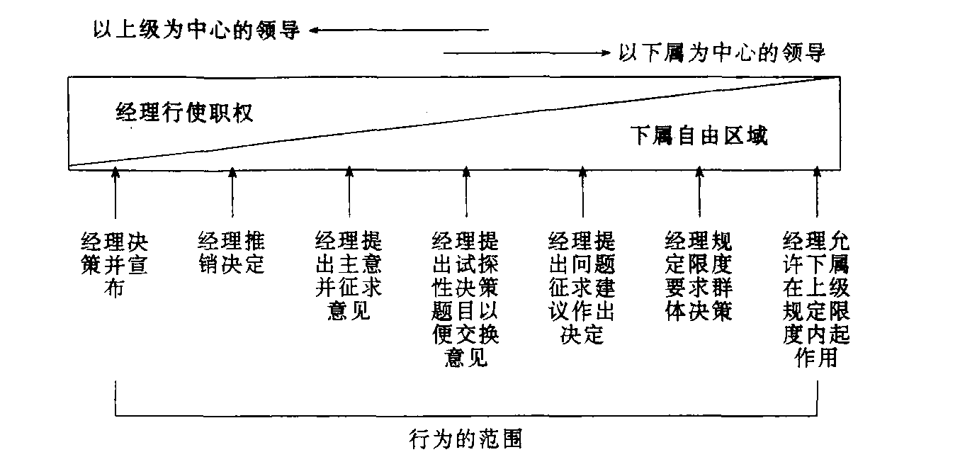 | 释义 | “领导方式连续统一体”理论Lingdao fangshi lianxu tongyiti lilun美国行为科学家施米特和坦南鲍姆提出的一种有关企业领导方式的理论。该理论认为,现实中不仅存在民主与独断两种领导方式,还有其它类型,大致可分为7种。每种类型的演变都包含了领导权力及影响和下属的权力与影响之间此消彼长的对立统一关系,如图所示: