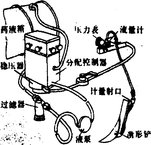 拖拉机悬挂式土壤注射机 结构如图2。按每次施药行数每行设置一个凿形铲,铲的入土深度可以调节。一个小型低压液泵将药液从药液箱经过滤器、稳压器和分配控制器,并经安装在每个凿形铲后面的输液管送到计量射口,射口设置在紧靠凿形铲尖后的地表以上。驾驶员可通过流量计监视施药状况。