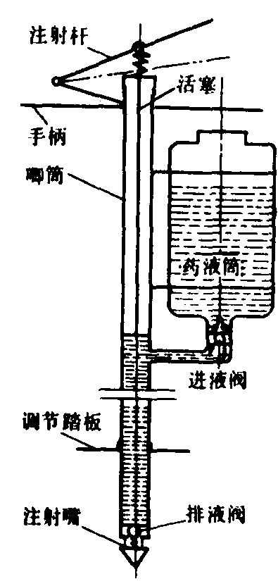 手动土壤注射器 结构如图1。操作者松开注射杆,活塞在弹簧作用下,上升一定行程,使药剂通过进液阀进入唧筒内。握住手柄,把注射器插入土壤,由深度调节踏板调节注射深度。压下注射杆则活塞下降,唧筒内的药液通过排液阀进入靠近末端的喷孔,向水平四个方向喷射。当液压降低,排液阀在弹簧作用下就关闭喷孔,停止喷射药液。拔出注射器,移到另一点注射。一般在整片土地或沿即将播种和移栽的行里进行注射,注射点的间距是由作物间距、土壤类型和施用剂量决定。其生产率较低,一台手动注射器一天处理面积约7亩。