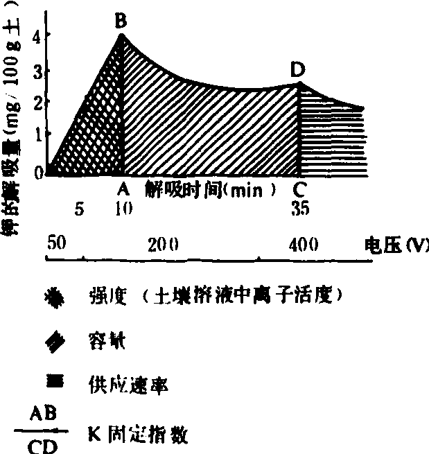❸在400伏电压,30~35分钟的电超滤钾量(即CD值),可用于推测土壤溶液中钾的浓度在植物生长季节可能降低的程度。CD值(图)越大,整个生长季节土壤溶液中钾的浓度也越高。如果CD值高峰不出现,则表明土壤缺乏缓冲能力,土壤溶液中钾的浓度就会降低;