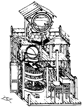 苏颂、韩公廉等在汴京 (开封)创制水运仪象台 (图),是世界上第一座结构复杂的活动天文钟。其中有巧妙的擒纵装置,似近代钟表中的擒纵器。