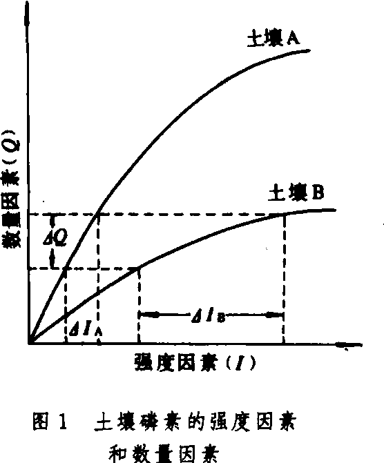* 磷位(1/2Pca+PH2PO4)中1/2Pca一般为常数,故这里用RT ln aH2PO4表示; * * 括号外数字为磷活度(M×10-6),括号内数字为1362×log aH2PO4(卡/克分子) 测定土壤磷素强度因素通常有4种方法:❶测定土壤溶液的全磷含量。 ❷测定土壤溶液中H2PO-4或HPO-4的活度。 ❸测定H2PO-4的化学位。 ❹测定磷酸一钙位(磷位)。第一种方法较常用。因为简单方便。其他方法均需计算磷离子活度。 数量因素 与土壤溶液中磷酸离子处于平衡状态的土壤固相的磷量。 由于土壤溶液中磷的浓度和作物需要量相比是很少的,一般肥沃土壤中,土壤溶液磷的浓度也只有0.3~0.03毫克/升,如果土壤溶液为土重的20%,那么每公顷土壤耕层中土壤溶液中的磷量也只有0.01~0.14千克/公顷,但一季作物在中等产量时需要磷20千克/公顷左右。如果作物单纯依靠土壤溶液中的磷,那么,不仅磷的浓度要急剧下降,而且很快就被消耗殆尽。但在磷浓度为0.2毫克/升的情况下,作物一般都能得到磷的充分供应。这是因为一旦土壤溶液中磷被吸收,固相养分会很快补充进去而大体保持磷浓度的不变。这种与液相磷处于平衡状态的磷量,称为土壤磷素供应的数量因素(活性磷,labile P)。因此,不同的土壤即使具有同样的磷素供应的强度因素,如果它们的磷素供应的数量因素不同,它们的养分供应能力也不可能是一样的。但是,由于土壤性质的复杂性,至今还没有一个比较满意的方法定量测定数量因素。常用的有同位素测定(A—值和L—值)法、生物提取法或化学提取法(包括树脂法),以及有效磷的化学测定法。也有人建议用兰米尔(Langmuir)方程中的最大吸附量作为数量因素。但这些方法,只能近似地测定土壤磷素供应的数量因素。 缓冲能力 (buffering capacity,BC) 是土壤磷素供应强度因素(I)和数量因素(Q)的比值(Q/I)。它表征土壤保持溶液中磷素浓度的能力。 将土壤养分供应的强度因素和数量因素两者作图(图1)。即可从图看出,其直线的斜率为△Q/△I,即土壤的缓冲能力。若I 以养分位表示时,则为土壤磷素养分供应的磷位缓冲能力(potentialbuffering capacity,PBC)。可见,土壤养分的缓冲能力,就是土壤养分强度因素每变动一个单位时,数量因素变动的数量。如有A、B两个土壤,它们的缓冲能力是: