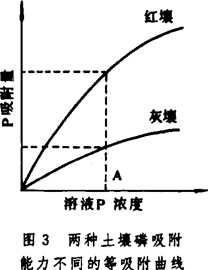 图3是不同土壤磷吸附的等温线。从图中可以看到,在灰壤中,要使土壤溶液的浓度达到最适浓度A,所需加入的磷量(磷的吸附量)要比红壤小得多。也就是说,红壤对磷的缓冲能力要比灰壤大得多。因此,我们可以通过磷的等温吸附线来测定不同土壤的磷肥需要量。 供应过程 磷素养分在土壤中向根运动与植物根系接触并吸收的过程。它包括根系截获、质流和扩散。