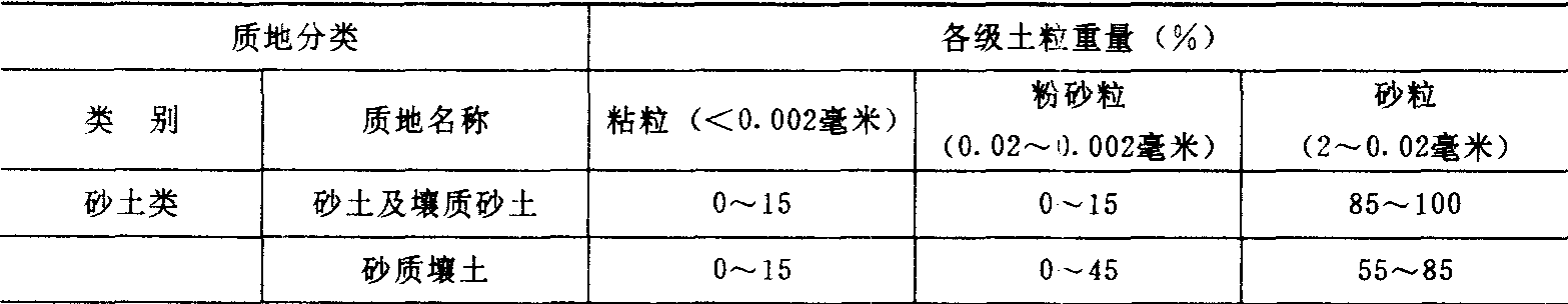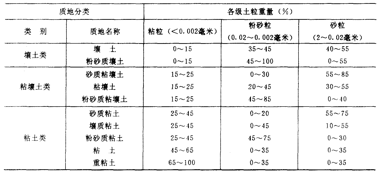 土壤质地Turang zhidi粗细不同的土壤颗粒的比例组合。又称土壤机械组成。是土壤的重要性状。分为砂土、壤土和粘土等类型。土壤质地的特点主要取决于成土母质类型和成土过程的特点,并受人类耕作、施肥等措施的影响。如在石灰岩、红色风化壳和玄武岩上发育的土壤,粘粒较多,质地粘重;在花岗岩及砂页岩上发育的土壤,质地中等;在砂岩、片岩及砂质沉积物上发育的土壤,质地最轻。不同作物对土壤质地的要求不同。各国对土壤颗粒的分级不同,土壤质地分类也各异。 中国土壤质地分类标准(暂拟方案) 国际制土壤质地分类标准