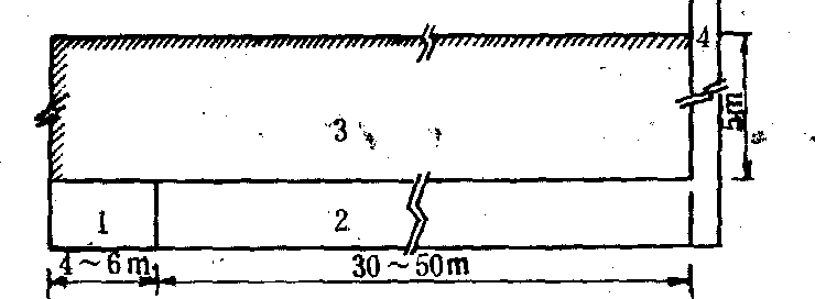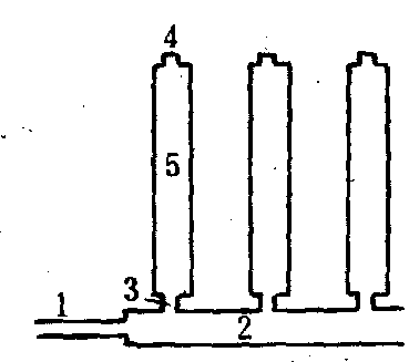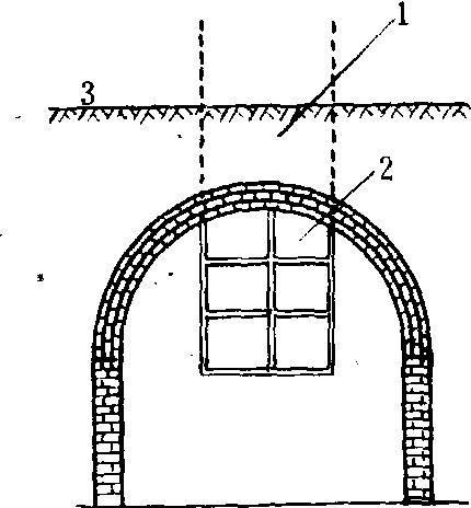 图 3 梳子型窑平面示意 地下式砖窑 山西、陕西、河南、河北等平原地区开明沟砖砌地下式窑洞。一般窑宽、高各4米, 长30~50米,窑顶弧形, 呈半圆形,半径2米, 窑顶弧形厚度32厘米以上, 覆土1~2米, 窑墙直立部分高2米左右, 墙厚37厘米。在通气孔和窑身之间设可以开闭的排气窗1个,排气窗面积为窑洞横截面的1/3~1/2, 通气孔下口直径与排气窗面积相同, 上口直径略小, 其他结构与平窑相同(图4)。为了降低地下式砖窑洞的造价和建筑材料, 把两个地下式砖窑洞相邻砌旋, 共同使用一个通气孔成为双窑洞型, 这种结构曾风行一时, 但由于秋季降温慢, 效果不好, 相继被淘汰。