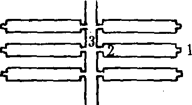 图 1 平窑型结构示意 母子窑(侧窑)型 中国山西、陕西、甘肃、河南等地陆续建立了一系列“非字型”、“梳子型”的母子窑,利用母窑(主巷道)运输、通风,子窑(侧窑)贮果(图2、3)。母窑长度最长可达100米以上,在母窑的两侧建子窑, 每个子窑之间的间隔至少在5米以上。利用母窑通风的子窑长度不超过10米,如超过10米,需另设通气孔, 结构如平窑, 但通风效果不如平窑。这种窑洞的特点是充分利用地形, 合理安排通风, 贮量可达100吨以上,但应注意通风设施, 以免空气滞留, 难以降温。 ![]() 图2 非字型窑平面示意