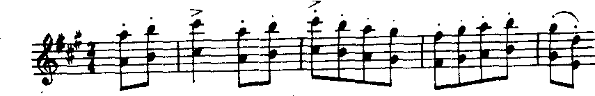 ❸“C”:转至A大调,右手用8度奏出有似小号吹奏的、雄壮有力的旋律与左手模仿小军鼓的敲击声结合,形成为有似胜利进行曲的主题。