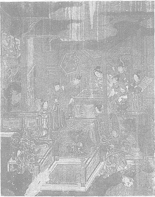 | 释义 | 圣母起居图(斋供)壁画明。纵283厘米,横226厘米。山西省汾阳县圣母庙圣母殿西壁壁画。此图展现的是为迎候圣母回宫而作准备的场景。画面上有殿堂一座,屋顶为卷棚式,殿柱及勾栏均为醒目的红色。殿前设盘龙云路。两位神将身披铠甲,手持宝剑,分脚而立,威武异常,作护卫状。殿内地铺花砖,正中置一方案,上摆灵芝、珊瑚、牡丹,持扇者立于案后。案前一侏儒头顶盛有灵芝的贡盘,几位宫女和侍者在忙于准备。一梳高髻,体态纤细,相貌秀丽的贵妇在案前审视着供品。此图所绘人物生动,因身分不同表情各异。人物服饰华丽,衣纹流畅自然,建筑物高大豁敞,勾画精细,具有皇家建筑的气派。全图设色以朱红、石绿为主,鲜艳协调,无俗硬之感。