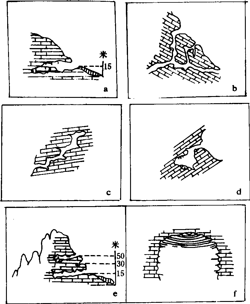 图1 洞穴的形态 a.水平状洞穴;b. 管道状洞穴;c. 阶梯状洞穴;d. 袋状洞穴;e. 多层状洞穴;f. 大厅状洞穴 有些廊道式洞穴中发育成地下河道,其形成的原因是当地表水转入地下后,遇有不透水层,地下水流可变成具有自由水面的地下河; 亦可由地表河流流入溶洞而形成地下伏流并可将洞外物质带入洞内。如果地下河重新流出地表,则形成喀斯特泉,在泉水的出口处有泉华堆积。