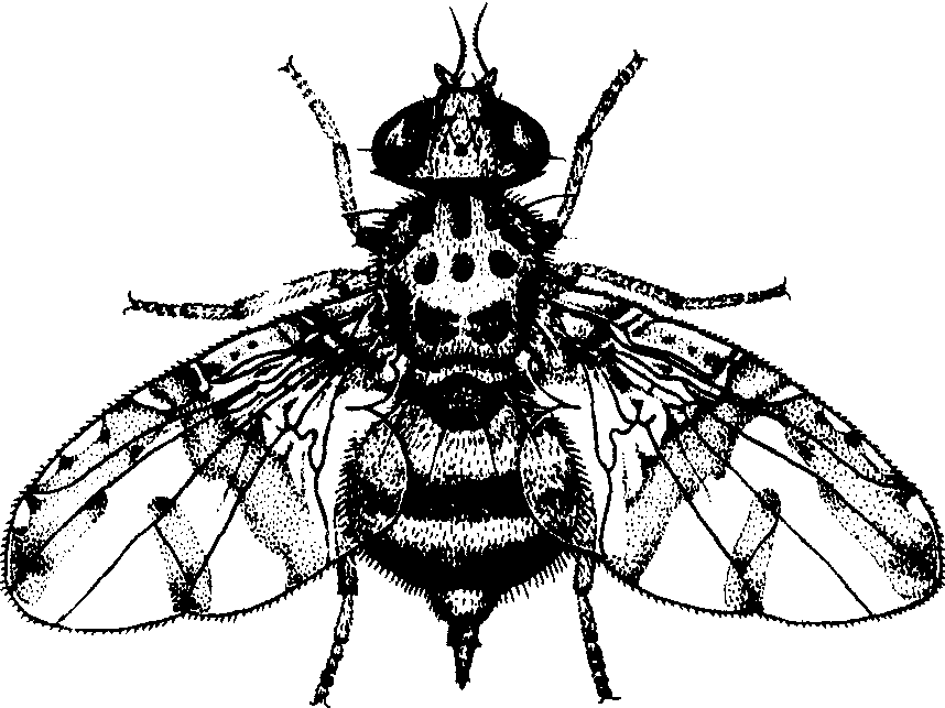 地中海实蝇(雌) 生活习性 在较寒冷地区,以蛹或成虫越冬; 常年有果实存在的温暖地区,可终年活动。法国年生2代;突尼斯3~4代;阿尔及利亚5代; 意大利南部5~6代; 埃及9代; 印度12代; 夏威夷11~16代。羽化后的成虫通常在附近的树丛中或灌木丛中,以蚜虫、蚧类分泌的蜜露为食。开始交配的时间,夏季在羽化后3~13天,秋季在羽化后6~26天。雌虫用产卵器在果皮上刺一深约1毫米的小孔,在孔中产卵2~6粒,一个大的果实内产卵可多达百粒。产卵孔周围有退色痕迹,在一些品种上呈火山喷口状的突起。每雌平均产卵500粒左右,最多可达800粒。成虫有趋光性,常在树冠光亮处活动。在缺乏食料和水时产卵减少,3~4天即死亡。如果有充分蜜露或果汁,夏季能活1~2个月,冬季3~7个月。温度低于11.7℃时卵不发育,26℃时,2~3天后幼虫孵化并钻入果实内,在果瓤中发育。幼虫期在温度24.3℃~26℃时为6~11天,11℃~16.5℃时24~42天,当温度低于11℃时停止发育。末龄幼虫脱果外出,钻入5~15厘米深的土中化蛹。个别的也可在果箱及包装物的隐蔽处化蛹,蛹期26℃时为6天,24℃时9~11天。 防治方法 主要以幼虫和卵随寄主植物的果实传播,幼虫和蛹也可以随农产品的包装物及苗木等所带的泥土传播。对疫区进口的果品和苗木等应进行严格检疫,防止传入。对已受害的或可疑的水果,美国采取低温或溴甲烷熏蒸处理,以杀死果实内的幼虫和卵。应用性诱剂(如实蝇诱醋Trimedlure)监测或预测发生期是最好的手段。在墨西哥、危地马拉、哥斯达黎加等国大面积应用喷洒水解蛋白加马拉硫磷药液和释放辐射不育雄蝇防治,获得良好效果。 地中海实蝇Mediterranean fruit flyCeratitis capitata Wiedemann,昆虫纲,双翅目,实蝇科。中国对外植物检疫对象。除远东和北美以外,遍布于世界亚热带地区。寄主有柑橘等120多种。成虫体长约45 mm;胸部背板黑色有光泽,镶以黄白色斑纹。腹部黄色,有灰色带两条,翅宽而短,有淡黄色带和黑色斑点。成熟幼虫体长7~9 mm,蛆状,白色至黄色。在凉爽地区,以蛹或成虫越冬;在温暖地区,则终年繁殖,一年发生7~12代。卵多产于暴露的果实上,以幼虫为害果肉。宜严格实行检疫制度,防止传入。