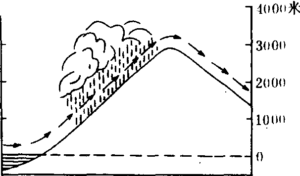 | 释义 | 地形雨Dixingyu暖湿气流在前进过程中遇山岭阻挡,被迫沿山坡抬升,水汽冷却凝结而形成的降水(如图所示)。其多发生在山地的迎风坡,中国台湾省向风的东坡年雨量均在2 000毫米以上,而背风的西部只有1 200毫米。雨量在迎风坡的分布,先是随着高度的增高而递增,达到了最大降水高度后,随高度的增高而递减。据观测,这个高度因地而异:印度尼西亚爪哇山地约为1 200米,美国加利福尼亚内达山约为1 500米,喜玛拉雅山为1 000—1 500米,阿尔卑斯山约为2 000米。另外,中国西南山地、江南丘陵地带的地形雨也很明显。世界上年降水量最多的地方基本上都和地形雨有关。