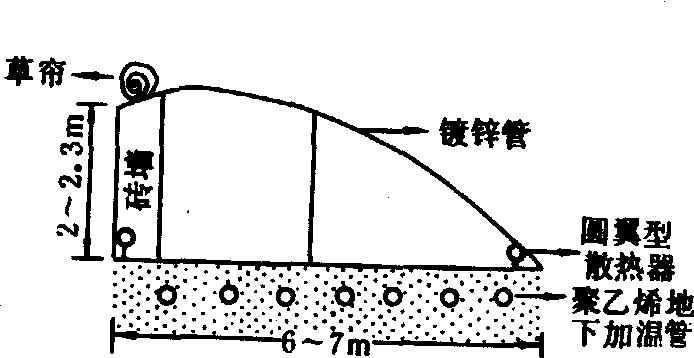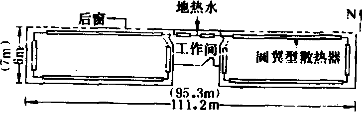 图2 单屋面塑料薄膜地热温室平面图 地热温室的结构与一般温室大致相同,有双屋面或单屋面的玻璃温室和单屋面塑料薄膜温室,后一种地热温室造价低,保温性好,操作方便,其结构剖面如图1和图2所示。 地热温室的地下加温应满足以下技术要求: