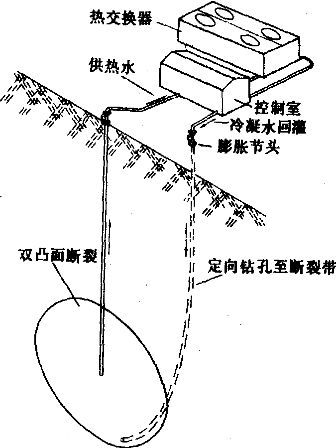 地热发电geothermal power generation地热能由载体通过转换系统变成电能的过程。1904年在意大利拉德瑞罗地热田建造了世界上第一套小型地热发电机组,60年代以来,由于煤炭、石油耗量剧增而资源储量有限,人们开始转向寻求新能源,地热发电也随之有较大发展。目前全世界地热电站总装机容量超过5600兆瓦,其中以美国、菲律宾、墨西哥、意大利、日本和新西兰等国所占比例较大。 地热电站有蒸汽型和热水型两大类型。❶蒸汽型地热电站系统简单,从地热井喷出的蒸汽只要经过固体杂质的分离,就可直接进入汽轮发电机组发电,乏汽经冷凝后排放或回灌地下。地热蒸汽电站运行维修方便,经济性高。但由于高温蒸汽地热资源少,使这类电站的发展受到限制。美国的盖塞尔斯、意大利的拉德瑞罗、日本的松川等地热电站属于这类。 ❷热水型电站有两种基本系统,即内蒸系统和双循环系统。内蒸系统(或称扩容法)的原理是将地热水引入一个体积庞大的扩容器,容器内保持较低的压力。当地热水进入扩容器后,由于扩容减压,使其饱和温度也相应降至热水温度以下,从而使部分热水变为低压低温蒸汽去推动汽轮发电机组发电,乏汽经冷凝后排放或回灌地下。扩容内蒸后剩余的热水从扩容器底部排出,可供其他利用。这类电站系统简单,工质为水,维修容易;但设备庞大,效率较低。目前世界上的地热水电站绝大多数采用这种系统,新西兰的怀拉基(Wairakei)地热电站、中国西藏羊八井地热电站均属此类。双循环系统(或称中间介质法)的原理是将热水引入蒸发器,加热容器内的低沸点工质(如氟里昂、异丁烷等),使之变成蒸汽,然后通入低沸点工质汽轮机作功发电,排汽在冷凝器中被冷却水冷凝成液体后,用工质泵重新打回蒸发器再次加热,循环使用。这种电站设备紧凑效率高,可以利用温度较低的热水;但系统较复杂,密封性要求高,工质昂贵,运行维修也相当复杂。目前美国已有万千瓦级的这类试验电站在运行,但更多的还是小型试验机组,功率从几百到几千千瓦不等。 尚处在研究阶段的地热发电方法还有全流系统和干热岩发电系统(见图)。全流系统是将汽水混合物不经扩容器而直接送入螺旋转子膨胀机,水和汽在膨胀机内边膨胀边作功,排出时全部变为蒸汽,然后经冷凝排放。这种方法虽有其独特的优点,但效率很低,能否进入商业应用,目前尚有争论。干热岩发电的原理是将地下深处温度很高的干热岩用水力破碎法破碎,形成宽和深可达几公里的破碎区,然后从地面钻两个深浅不一的孔,分别达到破碎区的底部和顶部。将地面的河水从深孔灌入底部,流经破碎带吸收干热岩的热量后变成热水或蒸汽,然后从另一浅孔返回地面用前述方法发电,发电后的排水再灌入地下吸热,形成一个封闭循环。目前美国的新墨西哥州已建成一座这样的试验电站。