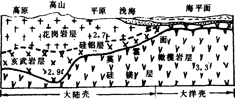 图2 地壳构造示意图 (据李四光,经简化) ❷地幔。指莫霍面以下古登堡面以上的圈层,底界为2900公里,其体积占地球总体积的82%,质量占67.8%,物质密度从上部的3.32克/立方厘米向下递增到5.66克/立方厘米,底界面上压力可达140万个大气压,温度从上部的1200℃到下部增到2000℃。按地震波的变化以984公里为界把地幔分为上地幔和下地幔。上地幔具有橄榄岩的性质,称为橄榄岩层;在距地表50~250公里范围内存在一个低速层,称为软流层,它可能是岩浆的发源地,地壳运动、岩浆活动、火山喷发和地震活动等都可能与此层有关,特别是中源和深源地震的震源都发生在上地幔中。下地幔主要由金属硫化物和氧化物组成,因铁镍成分显著增加,又称为金属硫化物——氧化物层。 ❸地核。古登堡面以下到地心称为地核。根据纵波的变化情况又可分为外核、过渡层和内核。据推测,地核物质非常致密,密度达9.7~17.9克/立方厘米。地核体积仅占整个地球的17%,但其质量却占31.5%。地核内压力可达300~360万个大气压,温度为2000~3000℃,最高不超过5000℃。关于地核的物理状态和化学成分是个有争议的问题,由于横波不能通过,有人认为地核物质接近液体,有人认为地核物质大概是固体,也有人认为是超固态物质。有人根据现代实验资料证明地核呈液态。多数研究者认为地核的化学成分为铁镍物质组成,类似于铁镍陨石的成分,称为铁镍地核说。 |