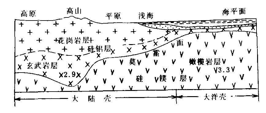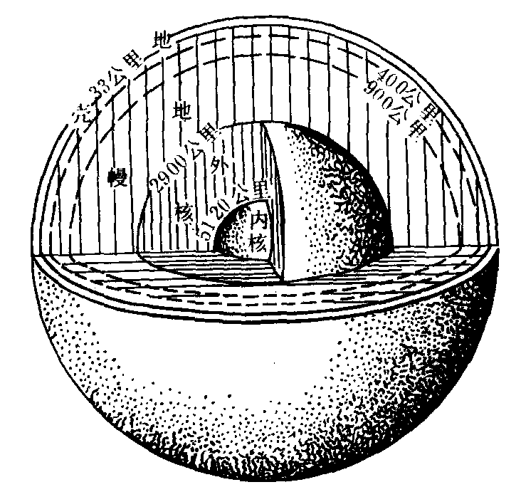 | 释义 | 地球的内部构造Diqiu de neibugouzao由地表至地核的构造。地球内部的构造不可能直接观察,主要利用地震波在地球内部的传播情况来间接地推测。大约从地表向下平均33公里深处,地震波纵波速度为7.6公里/秒,横波为4.2公里/秒,再向下纵波急增到8.1公里/秒,横波为4.6公里/秒。这个波速不连续面称为莫霍洛维奇不连续面,简称莫霍面。在距地表2 900公里深处纵波速度由13.64公里/秒突然降为8.1公里/秒,而横波至此完全消失,这个不连续面称为古登堡面。根据这两个不连续面所反映地球内部构造的情况,可将其划分出三个圈层:地壳、地幔和地核(如图)。❶地壳。位于莫霍面以上部分称为地壳。地壳表层岩石平均密度2.65克/立方厘米,处在常温常压下。地壳底部密度增加到2. 9克/立方厘米,温度可达1 000℃左右,压力可达1万多个大气压。地壳又可分为大陆型和大洋型两种,大陆型地壳厚度较大,平均约33公里,高山地区厚度更大,我国天山及西藏地区可达70公里厚。大洋型地壳厚度小,平均只有7. 3公里。地壳的总体积约为地球体积的1%,其总质量只占地球总质量的0. 8%。地壳的上层主要由花岗岩和沉积岩组成,称为花岗岩层,在山区厚达40公里,在平原仅为10公里左右,在大洋底则很薄,甚至缺失。地壳的下层主要由玄武岩组成,称为玄武岩层,在陆地上较厚,可达30公里,在深海盆底仅为5—8公里厚。因为这两层的化学成分都是以硅铝为主,总称为硅铝层。地壳之下为橄榄岩层,密度较大,属地幔上部,因铁、镁含量较高,又称硅镁层(如图)。