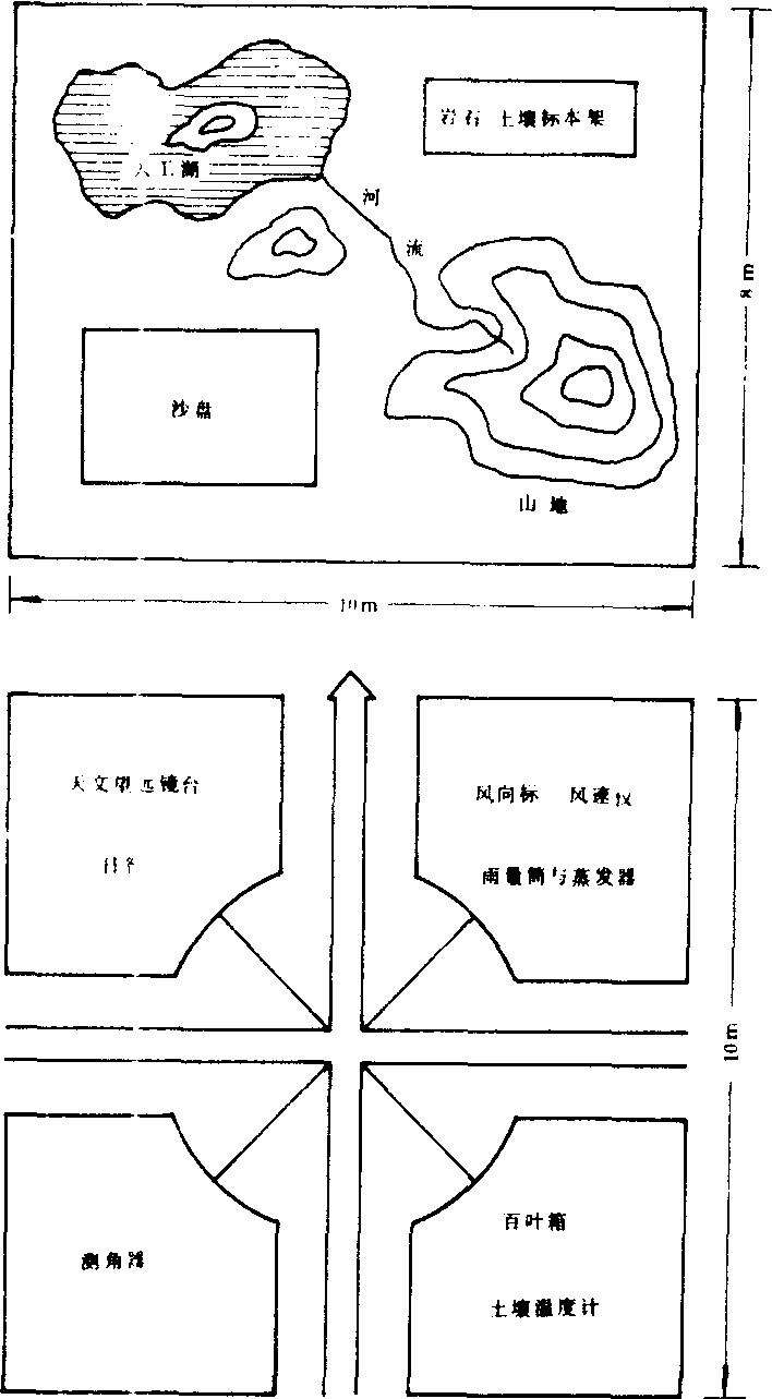 是供学生在学校内进行地理实践活动的园地。它既是地理教学的场所,也是地理课外小组的活动场所。地理园应建在校内地势略高的空旷场地上,其设置应根据学校条件、地理教学的要求以及地理课外活动内容而定。下图是常见的地理园设置方案。