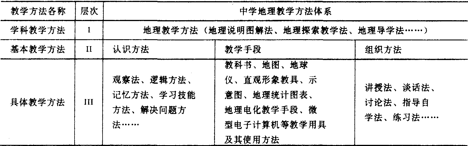 | 释义 | 地理教学方法体系dili jiao xue fangfa tixi中学地理教学方法是指在中学地理教学过程中,为达到中学地理教学目的,由教师设计,教师与学生共同实施的协调教学诸要素之间关系的活动方式(或方式系列)。由于教学过程是由多种活动所组成,所以其活动方式(系列)也必然多种多样,进而中学地理教学方法的种类也就十分复杂。但是,众多的地理教学方法之间又是相互联系、相互影响成为一个有序的整体,这就是地理教学方法体系。正是由于存在着地理教学方法体系,才保证了地理教学活动的顺利进行。目前,建立中学地理教学方法体系的方案有很多,下面介绍的是根据地理教学方法内部的结构建立起来的地理教学方法体系(见表)。 中学地理教学方法体系