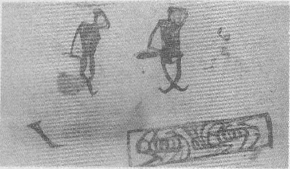 | 释义 | 地画画在屋内地面上的图像。1982年10月在甘肃秦安县五营乡大地弯房基遗址中发现,属仰韵文化晚期,距今约5千年。此地画位于室内后壁的居住面上,用黑色颜料绘制成。经甘肃省博物馆文物保护实验室鉴定,黑色颜料为炭黑。画面占地东西长约1.2米,南北宽约1.1米。地画形象有人物和动物图案,上部正中一人,高32.5厘米,宽约14厘米,头部较模糊,犹如长发飘散,肩部宽平,上身近长方形,下部两腿交叉直立,似行走状。左臂向上弯曲至头部,右臂下垂内曲,手中似握棍棒状器。该形象右侧尚存一黑色颜料残迹,推测也应为一人物。左侧亦绘一人,高34厘米,宽13厘米,头近圆形,颈细长,肩左低右高,胸部突出,两腿交叉直立,似行走状,左腿下残缺,手臂姿势同前者。在正中人物的下方12厘米处,绘一略向右上方斜的黑线长方块,长55厘米,宽14~15厘米,框内画两个头向左的动物,左边的长21厘米,右边的长26厘米,究为何种动物,难以确指。地画人物形象,被考古工作者推断为“祖神崇拜”之物(《文物》1986年2期)。