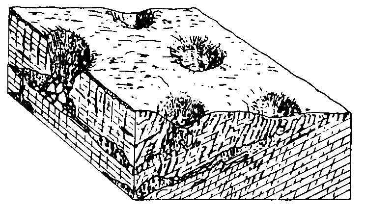 | 释义 | 地表喀斯特地貌dibiao kasite dimao在暖湿的气候条件下,含碳酸的水溶液对石灰岩的表面进行溶蚀,使地表形成一系列各种不同形态的地貌,称为地表喀斯特地貌。常见的地表形态有溶沟、石芽、石林、落水洞、漏斗、溶蚀洼地、喀斯特盆地、干谷和盲谷及峰丛、峰林、孤峰等。其形成过程为: 在温暖多雨的气候条件下,地表水流沿石灰岩坡面流动,顺着节理、裂隙进行溶蚀,形成宽深不一的沟槽,称为溶沟。溶沟宽十几厘米至几百厘米,深以米计,长度不等。溶沟之间突起的石脊称为石芽,其深度与高度可达数米(图1);石芽除裸露的以外,还有埋藏的,埋藏的石芽多是地下水渗透过程中溶蚀而成(图2)。发育在厚层的灰岩上的高大石芽,其间有平行垂直的溶沟,沟深坡陡,形似森林,故名石林,如我国云南省的路南石林。沿断层、节理发育的石灰岩台面上,地表常形成一系列的圆形或椭圆形的漏斗状凹地称为岩溶漏斗,直径为数米至十余米(图3)。按其成因有溶蚀漏斗、沉陷漏斗和塌陷漏斗等。在漏斗底部有时为石块或粘土堵塞积水成湖。漏斗是喀斯特发育初级阶段的产物,是岩溶水垂直循环作用的地面标志,因而漏斗多分布在喀斯特化的高原面上,如宜昌山原期地面上,漏斗较发育。垂直水流沿裂隙不断向下溶蚀并与地下河或溶洞相沟通,其通道的进口称为落水洞。根据落水洞形状有裂隙状、井状及袋状等。漏斗进一步溶蚀扩大与加深形成溶蚀洼地,直径可达10米至1~2公里。溶蚀洼地进一步扩展形成宽广平坦的盆地,宽度可达数百米至数公里,长度达几十公里,称为喀斯特盆地(波立谷),底部平坦,常覆盖着溶蚀残留的黄棕色或红色粘土,河流流经地区有冲积物,是石灰岩地区的重要农业区,在云贵高原,当地人们称其为 “坝子”。在石灰岩地区,地表由于水沿裂隙、孔洞下渗,河流多呈干谷; 有时河流沿落水洞流入地下,这种上下游封闭的谷地称为盲谷,转入地下河流的暗流段叫伏流,上述地貌在我国广西、云南、贵州等省可见。在喀斯特盆地的边缘广泛发育着峰林地貌,主要由峰丛、峰林、孤峰和溶丘组成,它们多发育在岩性较纯、厚度较大并多节理、断层的地区(图4)。峰丛主要发育在碳酸盐岩山地或高原边缘,指基座相连,山峰陡峭,称为峰丛,属于峰林地貌早期发育阶段。当喀斯特作用进一步向深处发展,则形成基座相互分离的陡峭山峰,远望如林,故称峰林,以我国广西桂林、阳朔等地最为典型。喀斯特发育晚期可形成孤立状分布在平原或台地上的残余灰岩山峰,称为孤峰,比高多在50~100米,如我国桂林的独秀峰、伏波岩等。