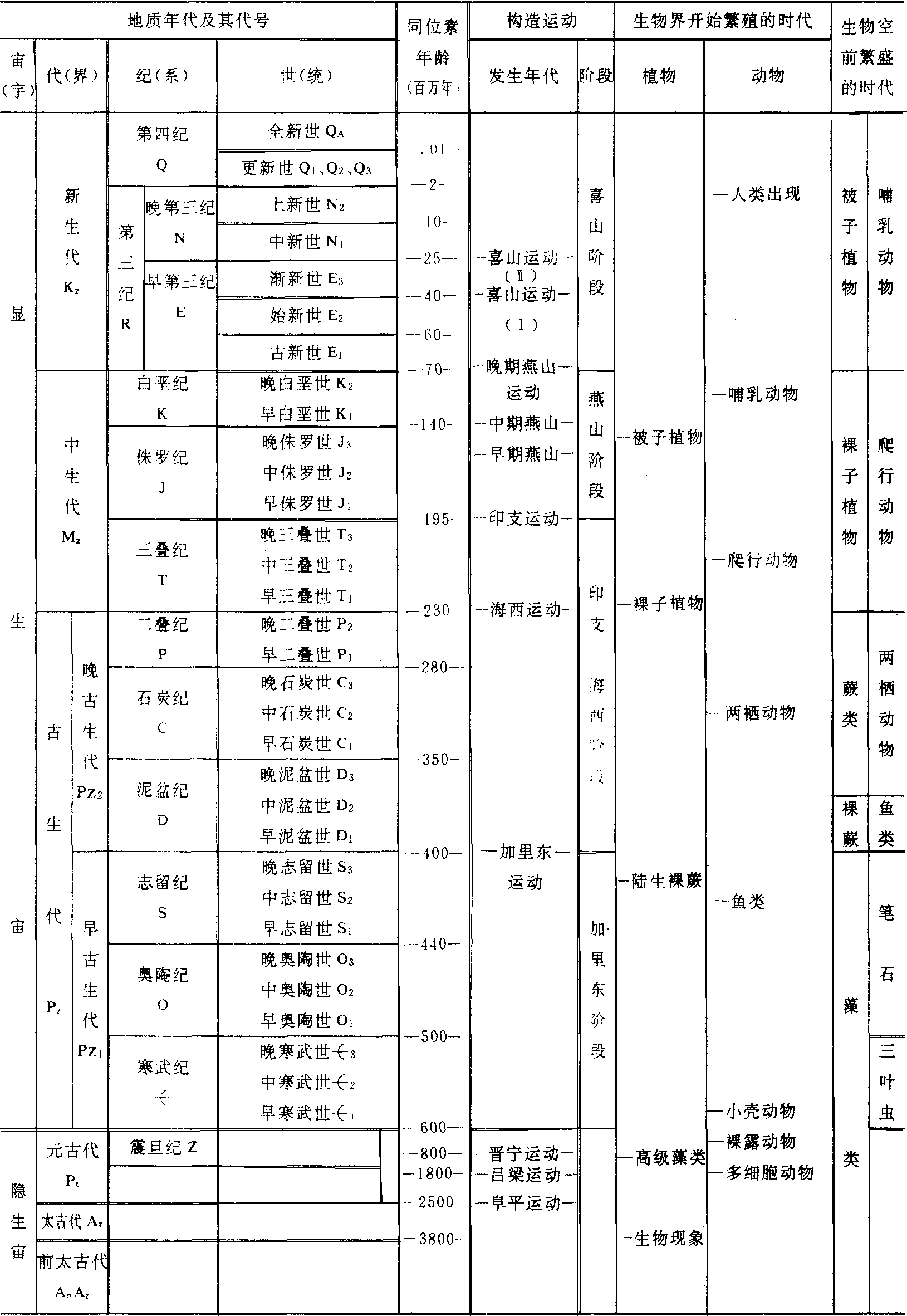 | 释义 | 地质年代表dizhi niandai biao又称“地质时代表”。是按年代顺序排列、表示地史时期的相对时代和同位素年龄值的表格。地质年代表反映了地壳历史的发展顺序、过程和阶段 (包括地壳中无机界和有机界的发展阶段) 以及绝对年龄 (如表)。 地质年代表