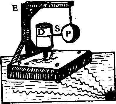 图2 地震仪原理 P.重鍾;S.杠杆;D.记录滚筒;E.支架 地震仪记录地震时地面质点运动的位移、速度和加速度的各种仪器。常用的是记录地面质点位移的地震仪,如伍德—安得逊式地震仪。 |