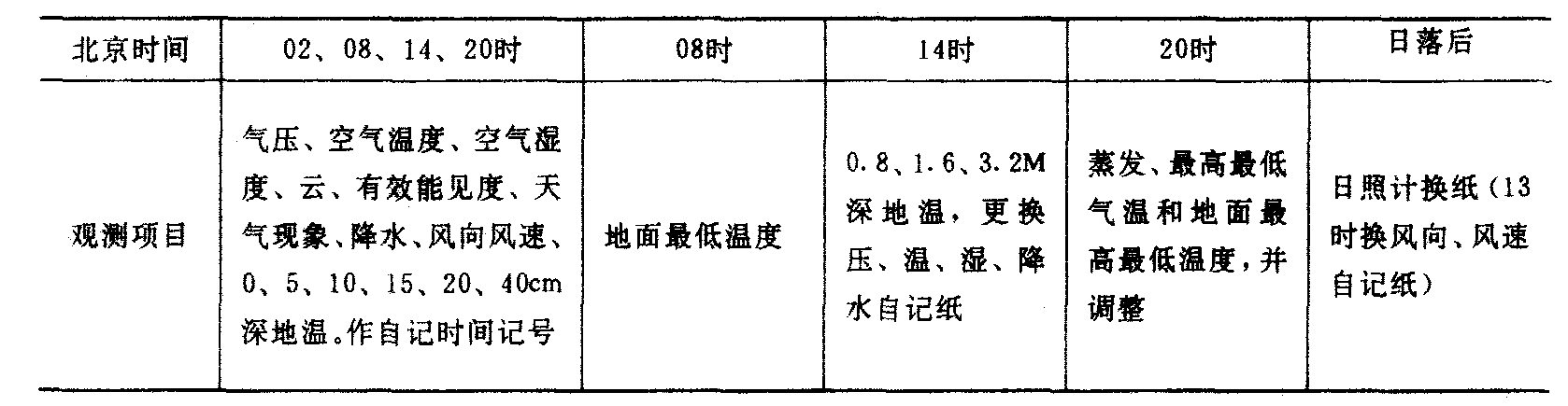 16×20观测场仪器布置参考图 1.重型测风器; 2.雨淞架; 3.轻型测风器;4.自记仪器百叶箱; 5.温度表百叶箱; 6.小型蒸发皿; 7.雨量筒; 8.日照计; 9.曲管地温表场地;10. 空白备用 地面气象站按其任务不同可分为下列几种: ❶天气站:主要为天气分析预报提供情报的气象站。 ❷气候站:主要为气候分析研究、积累资料的气象站。 ❸专业气象站:各专业部门根据需要而设立的气象站。如农业气象站、林业气象站、水文气象站、海洋气象站、航空气象站等。 ❹专项观测站:根据某些特殊需要设置的站,如辐射观测站、天电观测站、大气本底污染监测站等等。一般所说的地面气象站,主要是指❶和 ❷类,特别是❶类,它往往包括 ❷类所需项目。还有从事单项或少数项目气象观测的场所,称为气象哨,大多设在乡镇地区。 气象观测场是进行气象观测的主要场所,因而场地应选择在能代表大范围天气、气候的地点,而且地势平坦、空旷,四周没有高大建筑物、树林和大水域。观测场的大小有两种规格,一是25×25平方米,二是20 (南北向) ×16 (东西向) 平方米。场内要求平整,不应有洞穴、坑洼、突起地方,并种植浅草,以更好地代表广大地区下垫面特征。为了保护场地和仪器设备,场地四周围有高1.2米的通风铁丝网或木、竹围栏。围栏北面正中开一小门,以便出入。场内仪器安置部位和观测项目见上图和下表。 观则时间和项目