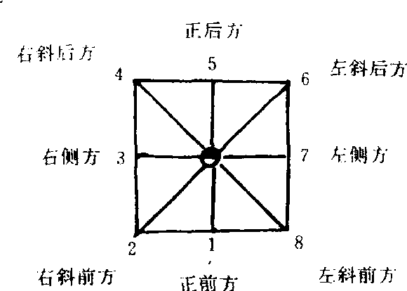 指场地的方向和位置。在学习动作时为了准确地辨别做动作的方向、路线和位置,在练习场地上确定基本方位。把练习者面向的正前方位置定为基本方位1,然后按顺时针方向转动,每隔45°为一个基本方位点,共8个方位点。正中点是指场地的正中位置,以符号表示练习者的站立方向,白为正面,黑为背面;1点为正前方;2点为右斜前方;3点为右侧方;4点为右斜后方;5点为正后方;6点为左斜后方;7点为左侧方;8点为左斜前方。在表演比赛时,可把面向主席台和裁判席的方向定为1点。