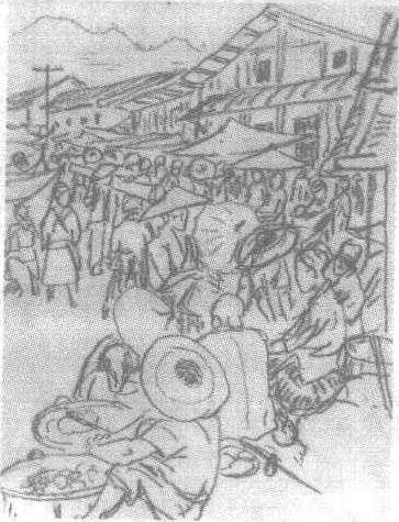 | 释义 | 场面速写范围很广,从内容上讲可分为人物活动和风景两大类。到生活中多画这类速写不仅是训练灵活的造型能力的有效手段,而且是认识和观察生活,为画家提供创作素材的最好途径。 场面速写Changmian suxie表现生活中众多人物活动情景的速写。场面速写需要组织画面的构图。所以,要首先明确表现的情调与气氛,怎样组织构图予以表达,作到胸有成竹,先画出在画面构图中起主要作用的人物关系或建筑,依此将画面组织起来。场面速写,要不拘泥于所见的角度,可从不同角度画,将人或物组织于一画之中,造成足够的气氛。要注意主次关系,画烘托气氛的次要部分轻松随意些,反而会增加画面用笔的生动性。如图。