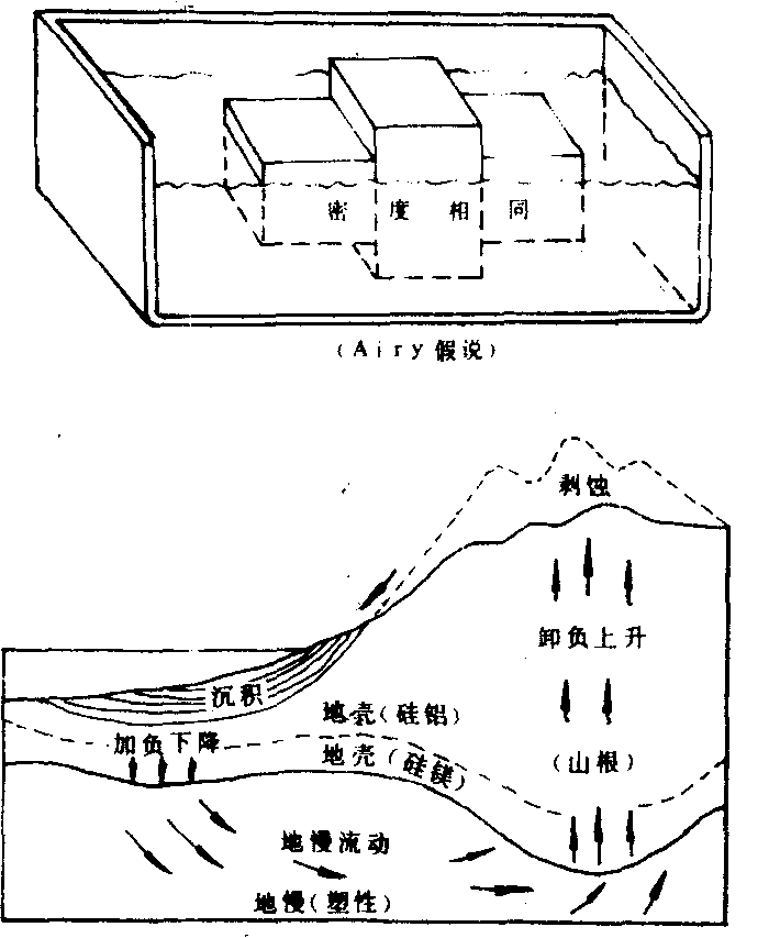 均衡说机制示意图 均衡说1889年达顿(Dutton,C.E.)提出的一种根据均衡原理和大地测量资料来解释地壳垂直运动的假说。阿基米德均衡原理指出,当把横截面积相同、重量相同但密度不同的柱状块体放在液体中,由于重力的影响,块体的下界将位于同一平面上,而上界却高低不平,密度小的高于密度大的,以此来保持液面上块体之间的平衡状态。达顿认为,地壳本应处于均衡状态,但由于地壳表面高低不平,在外力作用下山脉遭受剥蚀、盆地接受沉积;大陆遭受剥蚀、海洋接受沉积;这就使原来的均衡状态遭到破坏。由此,遭到剥蚀的、负荷减轻了的大陆、山脉等地区就要上升,接受沉积、负荷加重了的地区就要下降,以便达到新的平衡。这样,地壳的垂直运动的原因就可由重力不均衡来解释了。均衡说的弱点在于它提出的升降运动的机制是不可逆的,受重力作用下降的地区不可能转为上升,上升的地区也永远不会转为下降,这与地壳运动的实际不符。另外,它也不能解释地壳的水平运动。 |
