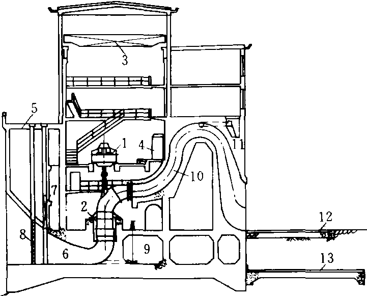 块基型泵房 1.电动机 2. 主水泵 3. 桥式吊车 4. 高压开关柜 5. 工作桥 6. 肘形进水流道 7. 检修闸门 8. 拦污栅 9. 排水廊道 10. 虹吸出水流道 11. 真空破坏阀 12. 防冲护坦 13. 防渗板 用钢筋混凝土将水泵基础、泵房底板、进出水流道浇成一个整体的泵房。适宜安装口径大于1 200 mm的大泵。层数随泵轴装置的不同而异,安装立式泵(轴流泵、混流泵、离心泵)的泵房为四层,从上向下分别为电机层、联轴层、水泵层、进水流道层;安装卧式泵(轴流泵、混流泵和贯流泵)的泵房只有二层,上层为电机层,安装水泵机组、电器设备、辅助设备等,下层为进水流道层。这种泵房具有整体性较好、抗滑和抗浮稳定性好、对不均匀地基适应性好等优点。适用于扬程较高、上下水位差大于10 m,地基条件较好的地方。中国已在江苏、湖北、湖南等省沿江滨湖地区建成多座这种泵站,如江都抽水站等。 |