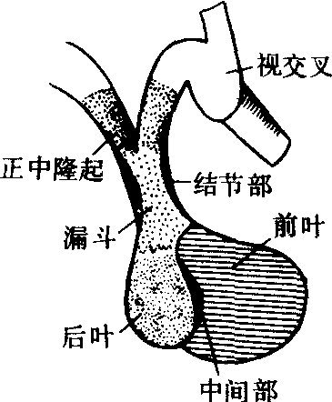 ❹黑色素细胞刺激素 作用于皮肤内黑色素细胞,使黑色素沉着,加深皮肤的颜色。神经垂体位于垂体后部,包括后叶、漏斗干和正中隆起。神经垂体与神经组织相似,无分泌功能,只是贮存激素的场所。它贮有由下丘脑视上核和室旁核有关神经元合成的抗利尿素和催产素。这些激素经下丘脑垂体束运输到神经垂体,当机体需要时便释放入血液以运送到靶器官。