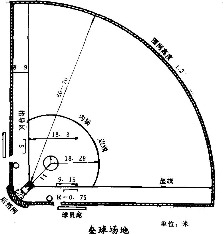 | 释义 | 垒球比赛场地和器材Leiqiu bisai changdi heqicai比赛场地应平整,无障碍物。正式比赛场地是一个以本垒板尖角为圆心,60—70米为半径,以1、3垒垒线为界线的直角扇形区域。投手板长60厘米,宽15厘米的木板与地面齐平钉牢于地上。本垒板用橡胶制成呈五边形,面对投手一边为45厘米,两边应与击球区内平行,长为20厘米,面对接手的两条斜边长为30厘米。除本垒板外,其它垒包均为38厘米见方,厚度不超过13厘米,用帆布等材料制成,钉牢在地上。正式比赛须用长度不超过87厘米,重量不超过