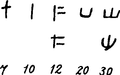 20世纪30年代初在章丘县城子崖发掘出土的陶片上,已记有五个数字符号(如图),其中后三个数字是合书。城子崖数字属新石器时代晚期文化,比甲骨文要早几百年到上千年。它证明,数目字的出现比甲骨文要早得多,也证明我国自古就形成了十进制记数系统。这在中国数学史上占重要一页。