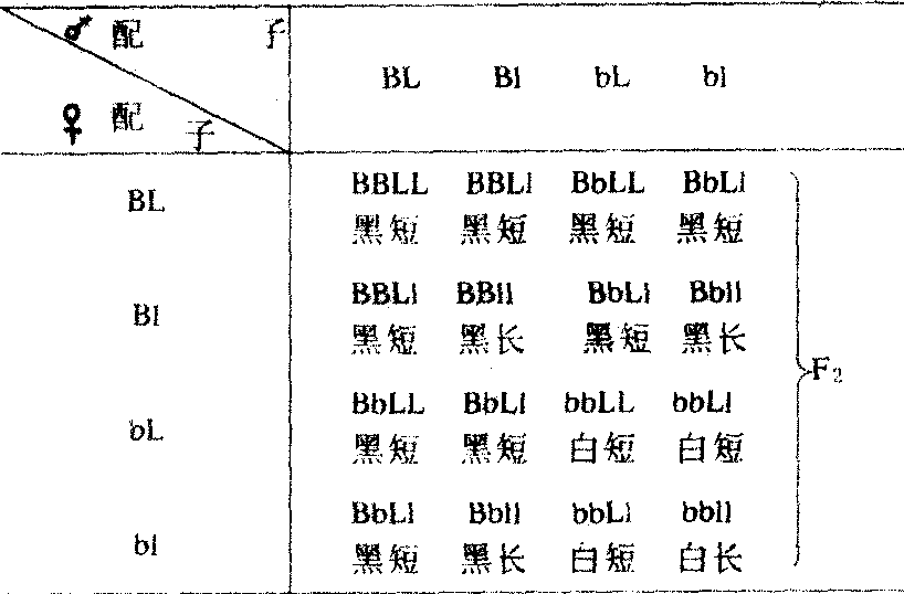 非同源染色体上两对或两对以上的基因,在形成配子过程中的自由组合(独立分配),又称独立分配规律。已知豚鼠控制毛色的基因座(BB或Bb=B_=黑,bb=白)和控制毛长的基因座(LL或L1=L_=短毛,11=长毛),分别位于两对同源染色体上。具黑色短毛(BBLL)和白色长毛(bbll)两纯系亲本杂交,由于黑对白以及短对长呈显性,所以杂交一代(BbL1)的表现型为黑色短毛。形成配子时,同源染色体分离,非同源染色体自由组合,即一对等位基因的每个成员与另一对等位基因的每个成员自由组合,所以F1形成配子的类型和比例为BL:Bl:bL:bl=1:1:1:1。F1相互交配,所得F2的结果如下表所示。