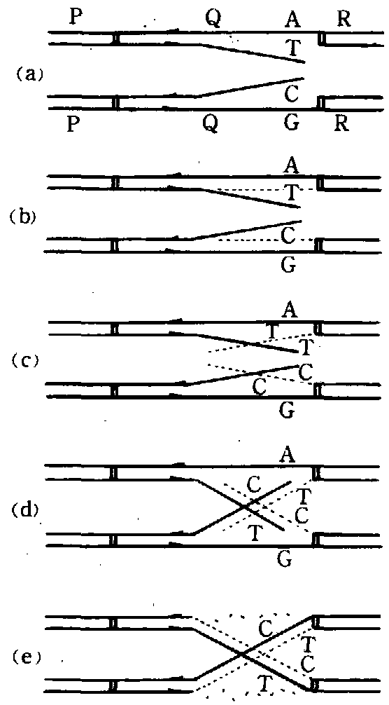 基因转变机制 怀特豪斯(H.Whitehouse)和黑斯廷斯(P.J. Hastings)于1965年提出极性子杂合DNA模式(图2)。他们假设,首先单链断裂和局部解开,继而与来自不同DNA分子的单 链形成 杂合DNA片段,组成一个极性子。每个极性子相当于一个基因,跨越极性子杂合DNA片段的交换都表现正常的相互重组。当交换发生于极性子杂合DNA片段之内时,重组的杂合DNA至少含有一个配对错误的碱基对,这就是形成基因转变的基础。每一个错配的碱基对的变化有两个可能:❶错配的碱基对中的一个碱基被酶切除,为正确的碱基所取代,发生误差校正;例如错配的碱基对为C-T,校正后为C-G或A-T; ❷错配的碱基对C-T,维持到下一次DNA复制,才转换成一个C-G和一个A-T,发生减数分裂后分离。由于杂合DNA可能发生减数分裂后分离,也可能发生误差校正; 切开的可以是这 一条单链或另一条单链; 在校正过程中可以是这一个碱基或另一个碱基被酶切除等,从而导致了基因转变的各种异常分离现象。可见对基因转变的研究,有利于探讨交换和重组的分子机制。 基因转变又称“基因转换”。在染色体倍性不发生变化或不存在重复基因情况下。子囊菌的四分体中所出现的基因不规则分离现象。 |