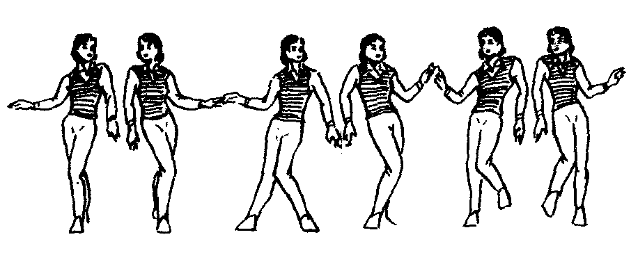 是健美操动作主要内容之一,包括各种走及舞步练习,能有效地加强老年人的协调性、节奏感及表现力。通过与手臂动作及身体各部位动作的配合练习,使其练习时更具有情趣,加上形式多变,极易使练习者达到引人入胜的境界。动作要领是:向前顶髋走直立预备。开始左腿屈膝向前迈出右腿伸直,向右侧顶髋,同侧肩下沉,两臂屈肘自然摆动,重心逐渐前移换另一腿,反复。向后顶髋走直立预备。开始左腿屈膝向后一步,右腿伸直,向右侧顶髋,同侧肩下沉,两臂屈肘自然摆动,重心后移换另一腿,反复。向侧顶髋走直立预备。左腿向左一步,屈膝内扣,右腿伸直,向右侧顶髋,同侧肩下沉,两臂自然摆动。如此反复,然后向反方向做。此外,柔软步、弹簧步、提踵步、变换步、华尔兹、垫步、十字步、交叉步等也是老年健美操常采用的基本步伐。(见图2—3—18)