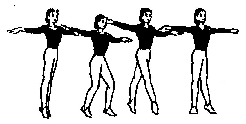 是艺术体操练习的主要内容之一,包括各种走、跑及舞蹈步等内容。同时配合手臂、身体姿态及各种轻器械练习,使之更具特色。它包括柔软步、滚动步、弹簧步、华尔兹步等等。老年人适宜选择节奏平稳、简单易学的步法。柔软步行进时落地脚柔软地从足尖过渡到全脚掌,两脚依次交替,两臂自然摆动,头及上体保持正直。练习时采用2/4或4/4拍音乐。滚动步两腿交替完成从垂直地面滚动下压至全脚掌着地的动作。弹簧步表现腿部弹性特点的步法,节奏为两拍完成动作,行进中支撑腿做脚尖过渡到全脚掌,接着屈膝然后依次伸直至提踵立。它包括普通弹簧步、前举腿弹簧步、跳弹簧步等,它是单脚立踵舞姿及跳步的基础动作。华尔兹步基本舞步之一,节奏为3拍,是由1个弹簧步和2个足尖步交替滑行的舞步,动作连贯起伏。可以做向前、向侧、向后及转体的华尔兹步。图2—3—21为向前的华尔兹步。