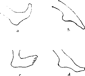 勾脚型:拇趾带动全脚向上回勾,到最大限度脚心向上翻(图a)。❷绷脚型:拇趾向下压,脚背向外绷起(图b)。❸㧟脚型:经过绷脚然后脚尖与脚腕尽量向里外翻(图c)。❹勾绷脚型:拇趾向上回勾。脚背向外绷起(图d)。