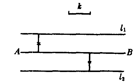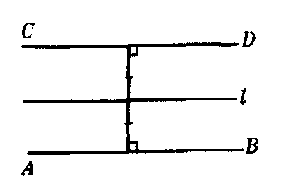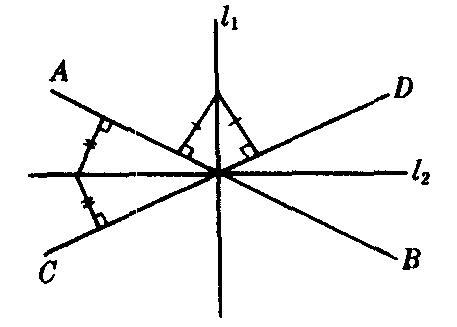 图4 推论 和两条相交的已知直线距离相等的点的轨迹,是这两条直线所成两组对顶角的平分线.如图4,l1,l2是和两相交直线AB,CD距离相等的点的轨迹. 基本轨迹命题4 和两条平行线距离相等的点的轨迹,是和这两条平行线距离相等的一条平行线.如图5,直线l是和两平行线AB,CD距离相等的点的轨迹. 基本轨迹命题5 和已知直线的距离等于定长的点的轨迹,是平行于这条直线并且和这条直线的距离等于定长的两条直线.如图6,直线l1,l2是和直线AB距离等于定长k的点的轨迹.