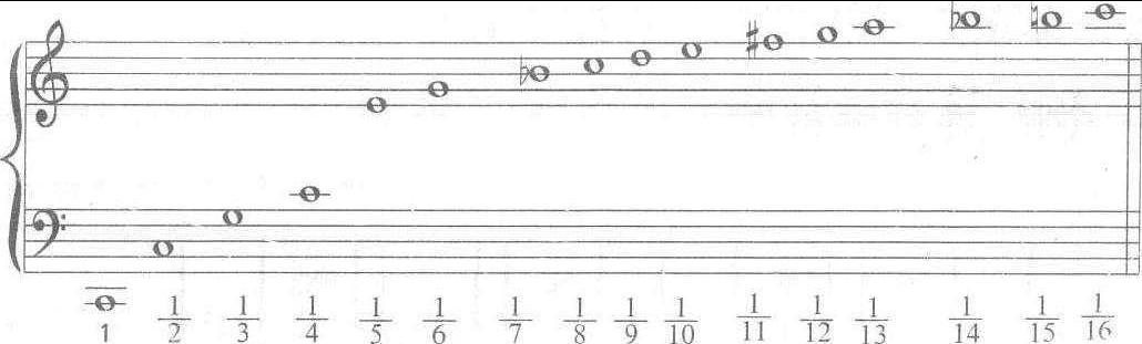 弦长比 基音 其中7、11、13分音比谱上所记稍低,13分音则比谱上所记稍高。 |