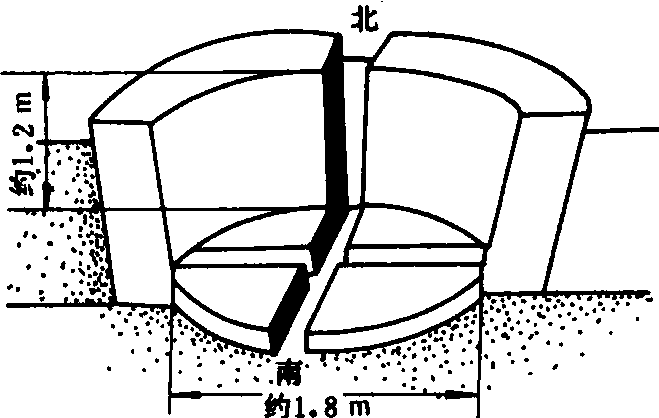 图1 圆形半坑式坑及沟的形式 高温堆肥在堆后5天左右,堆内的温度显著升高,一般可达70℃左右,待堆温下降后破堆,将材料充分翻倒,根据需要再加适量粪尿和水,重新堆积以使其腐熟均匀,通常翻堆2~3次便可腐熟。堆肥配料,一般根据材料和对腐熟时间长短要求的不同而调节秸秆和人畜粪尿的比例。多用两种配方,第一种,作物秸秆(包括泥炭):新鲜骡马粪: 人类尿:水为5:3:1:8~10;第二种,秸秆:骡马粪:人粪尿: 细土为3~5:1~3:5,水分为堆积材料重量的60%。在骡马粪和人粪尿不足的地区,可分别用相当于秸秆重量20%的老堆肥和1%~2%的化学氮肥代替。原材料准备好后,应先将秸秆类物质切碎,长度约5厘米左右,泼入2%的石灰水,拌匀待用。