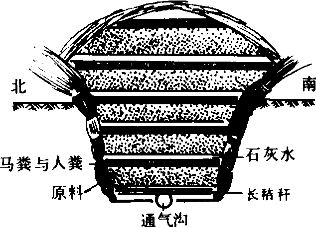 高温堆肥 也叫速成堆肥。具有通气好的特点。堆制的特点是接种高温纤维分解菌,并设有通气装置或通气塔,在高温条件下发酵分解。高温堆肥的堆制方式有两种:❶地面式。先在地面先铺15~20厘米厚已切碎(5厘米左右)的秸秆,再用玉米秆或高粱秆摆成井字形通气沟,各交叉点竖立小捆玉米秆后,再分层放入配料好的堆肥材料,堆后封泥,拔掉竖立的通气秆,即成通气孔; ❷半坑式。优点是保温、保水、保肥。坑为圆形(也有长方形),如图1所示。沟内放置秸秆柱,以利通气。坑底上以长秸秆纵横各铺上一层,厚约3厘米。掩盖底部的十字形沟,以免阻碍通气。再铺上已切碎的(长9~15厘米)堆肥材料,厚约60厘米,然后泼洒稀马粪、人尿粪混合液(马粪、人粪尿各100千克,加水250千克)和4%石灰水各一层。如此重复堆积,至原料铺完为止。堆肥材料的铺法是下层厚、上层薄;泼洒粪水混合液及石灰水的量是下层少、上层多。堆完整理堆的顶部,使其为丘形(图2),高出地面约30厘米。上部浇以污水,并用秸秆遮盖。